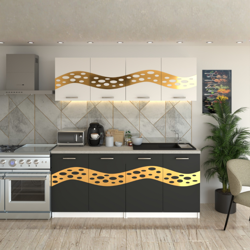 Bucătăria conține corpurile superioare, corpurile inferioare plus blatul întreg de 180cm sau 200cm. Chiuveta, electrocasnicele sau alte elemente de decor nu sunt încluse în preț!