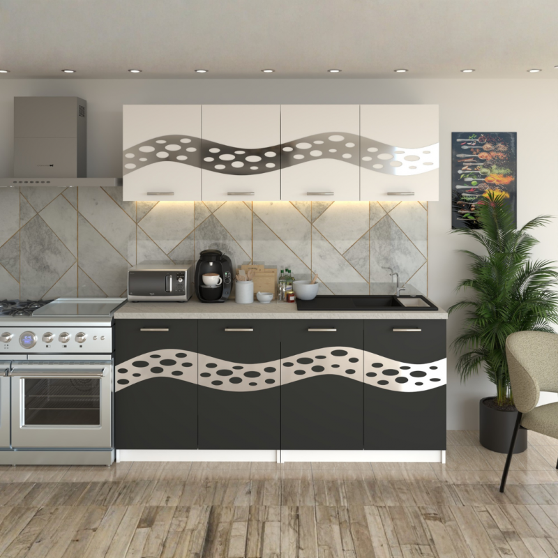 Bucătăria conține corpurile superioare, corpurile inferioare plus blatul întreg de 180cm sau 200cm. Chiuveta, electrocasnicele sau alte elemente de decor nu sunt încluse în preț!