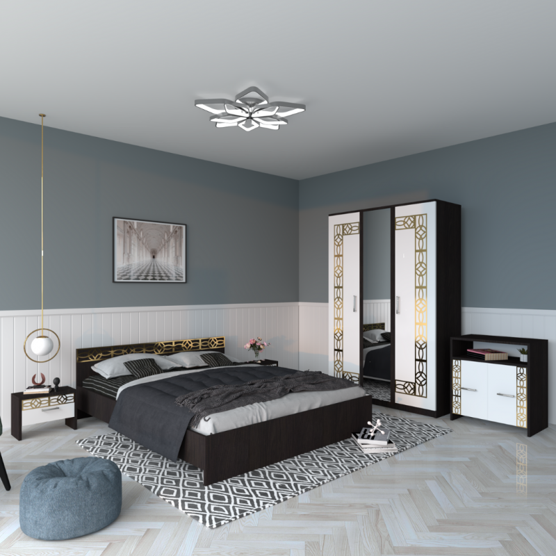 Dormitor Eva Wenge Cu Oglindă + Comodă (Inserții Aurii)